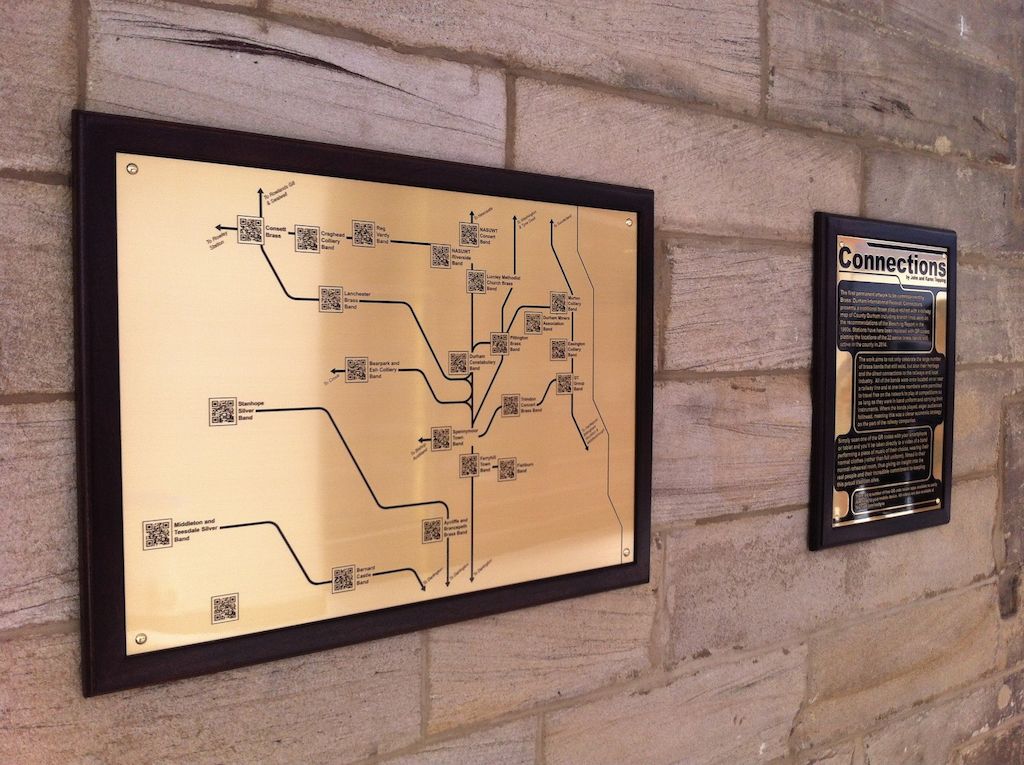 As part of Durham Brass Festival, Spennymoor Town Band are taking part in a project called Connections. Connections takes the form of a map based on the pre-Beeching railway network to present a snapshot of the brass band movement in County Durham as it is today in the 21st century. The etched map, made of brass plate to recall the heritage of the county, replaces railway stations with QR codes that when scanned with a smartphone direct you to digital media content of twenty-two bands rehearsing in rooms across County Durham.